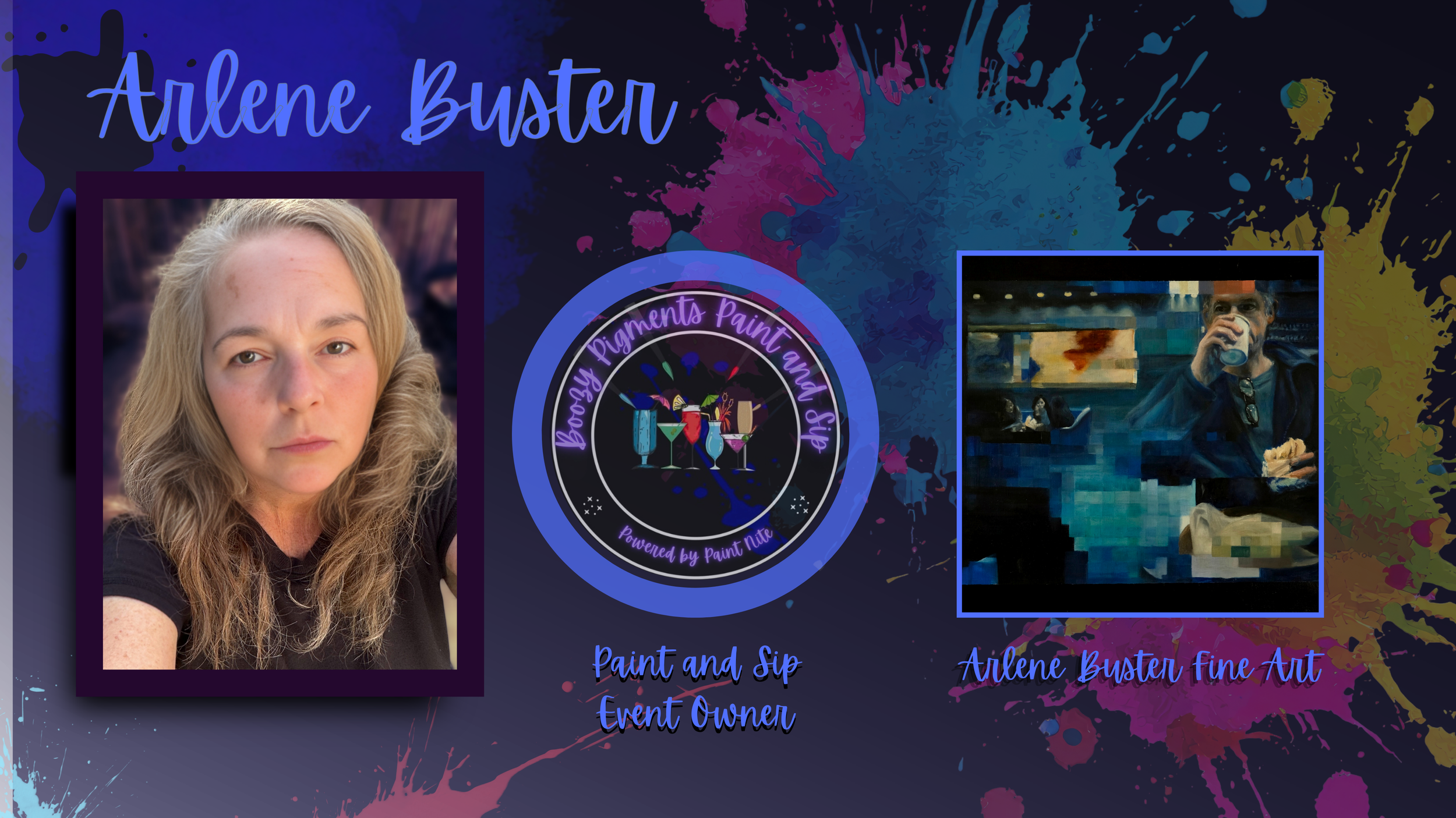 Arlene Buster is the owner of Boozy Pigments Paint and Sip, a fun and creative business powered by the Paint Nite experience. With a BA and MFA in Fine Arts, Arlene specializes in figurative oil painting in her personal studio. In addition to her own artwork, she offers engaging paint and sip events in Los Angeles, Pasadena, and Duarte, where both beginners and experienced artists can sip, paint, and create their own masterpieces.